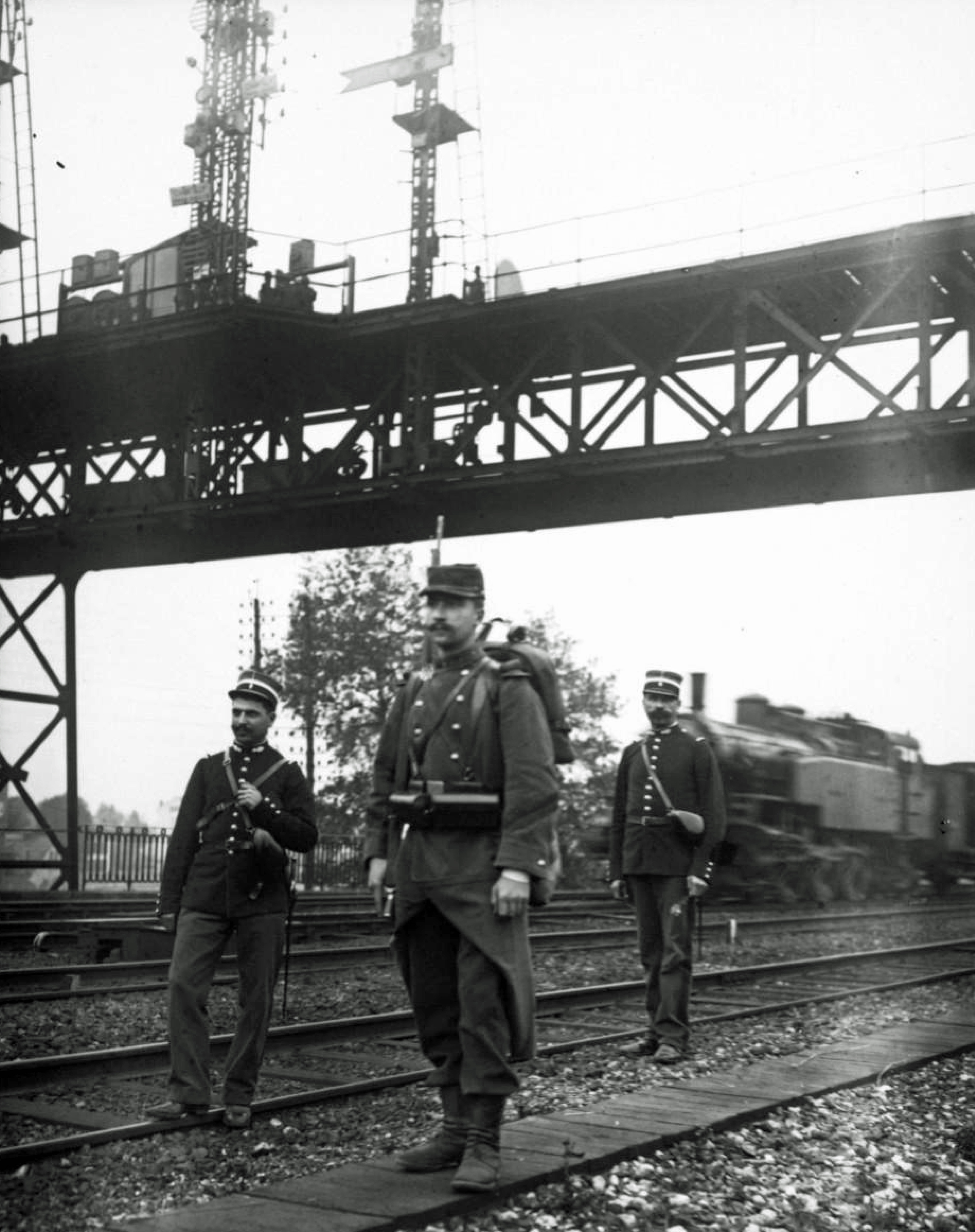 photographie de presse / Agence photographique Rol (commanditaire). Octobre 1910, grève des cheminots de la gare Saint-Lazare, soldats gardant les voies.